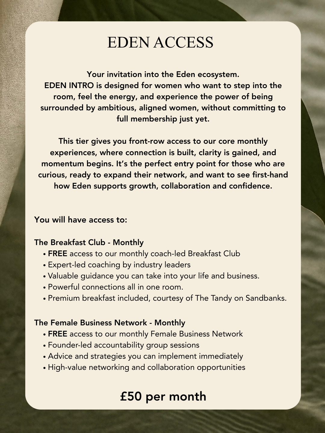 This tier gives you front-row access to our core monthly experiences, where connection is built, clarity is gained, and momentum begins. It’s the perfect entry point for those who are curious, ready to expand their network, and want to see first-hand how Eden supports growth, collaboration and confidence.