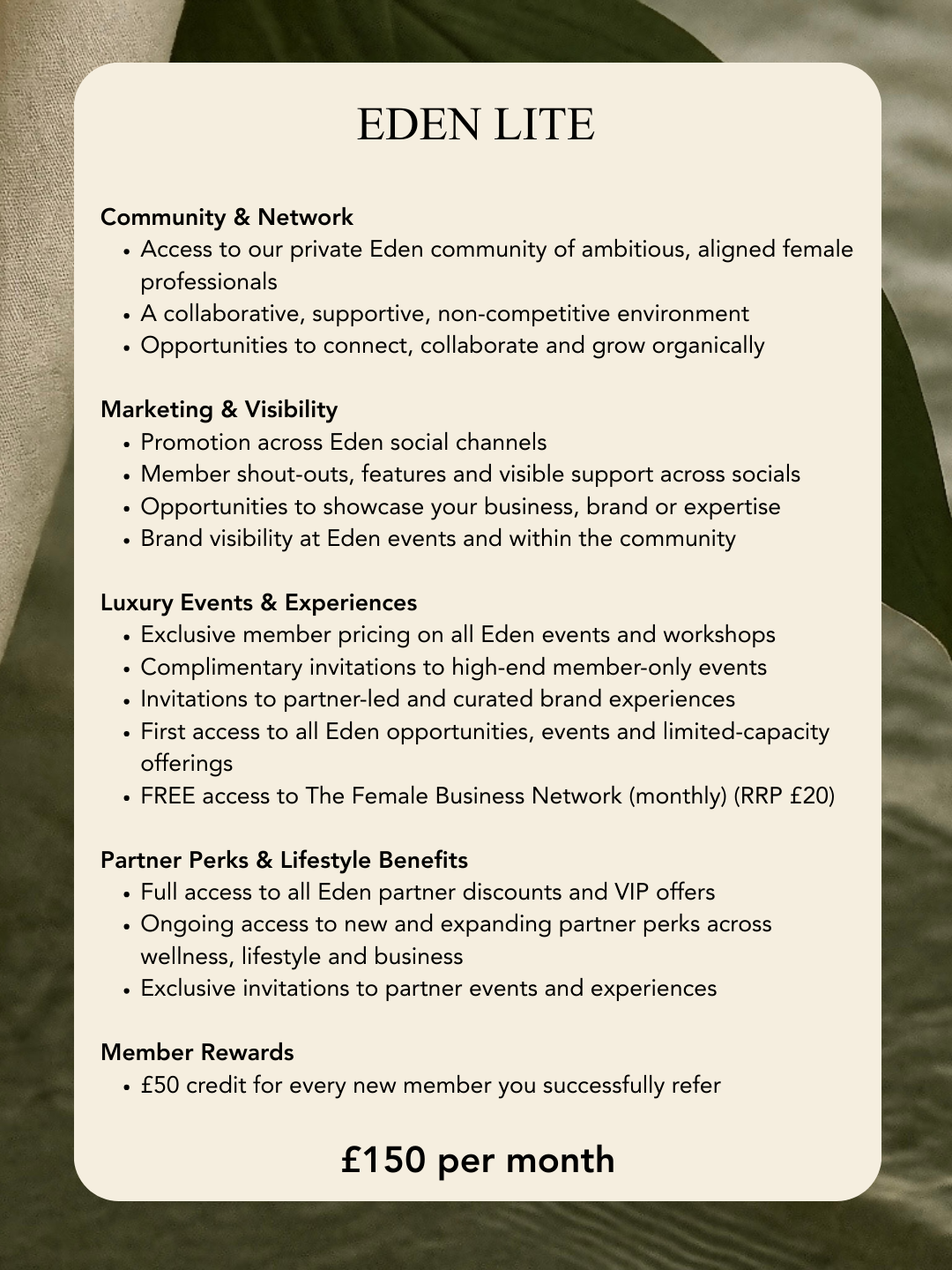 EDEN offers three intentionally curated membership options, each giving you access to a powerful collective of women, exclusive opportunities, and elevated experiences, with the freedom to choose the level of membership that fits your season of life and business.